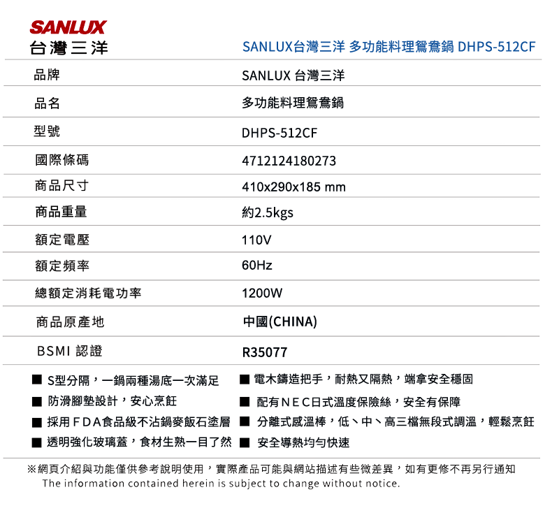 1, 多功能料理鴛鴦鍋 110V 50-60Hz,最大功率1200W