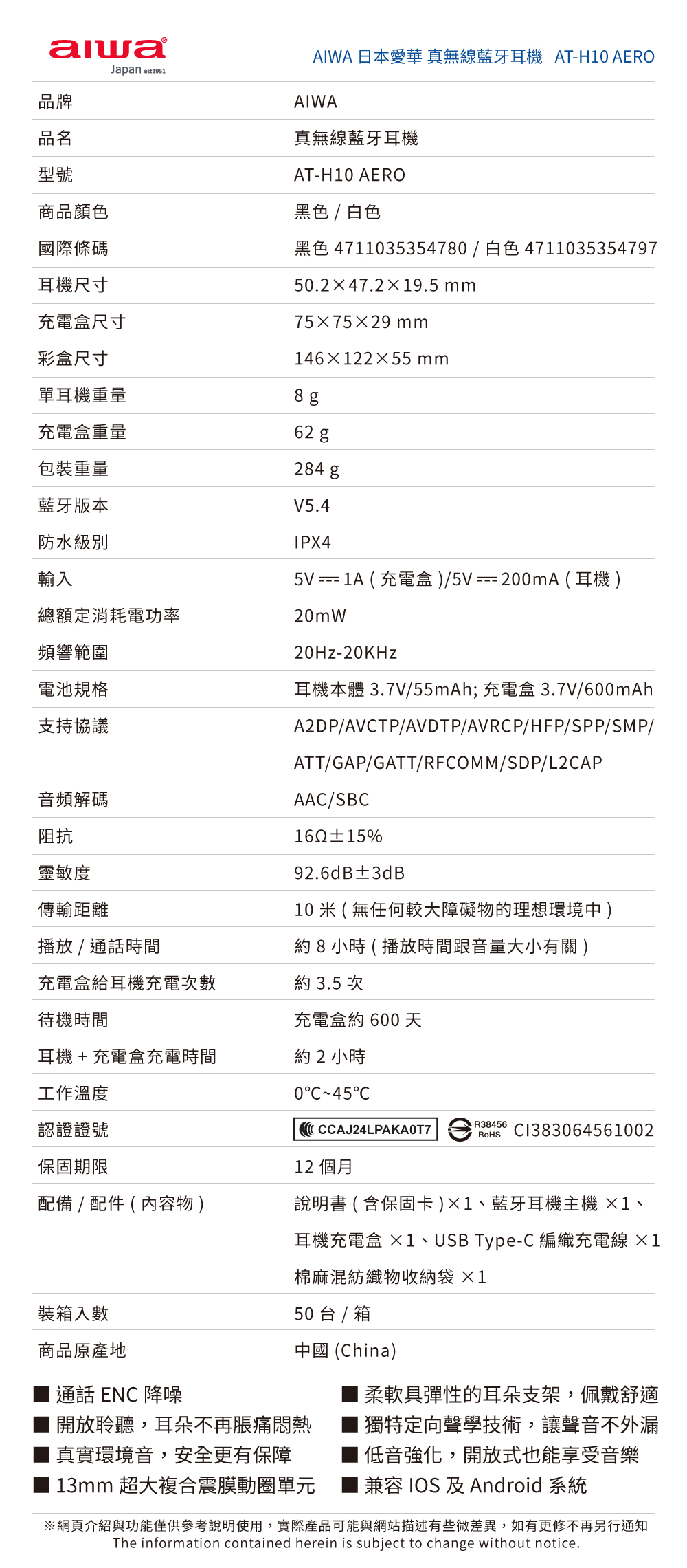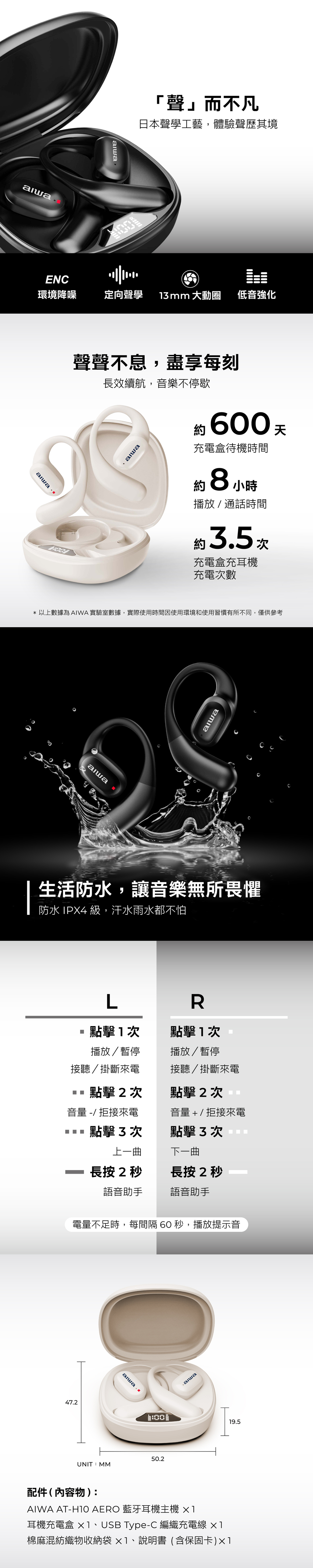AIWA 愛華 真無線藍牙耳機 AT-H10 AERO