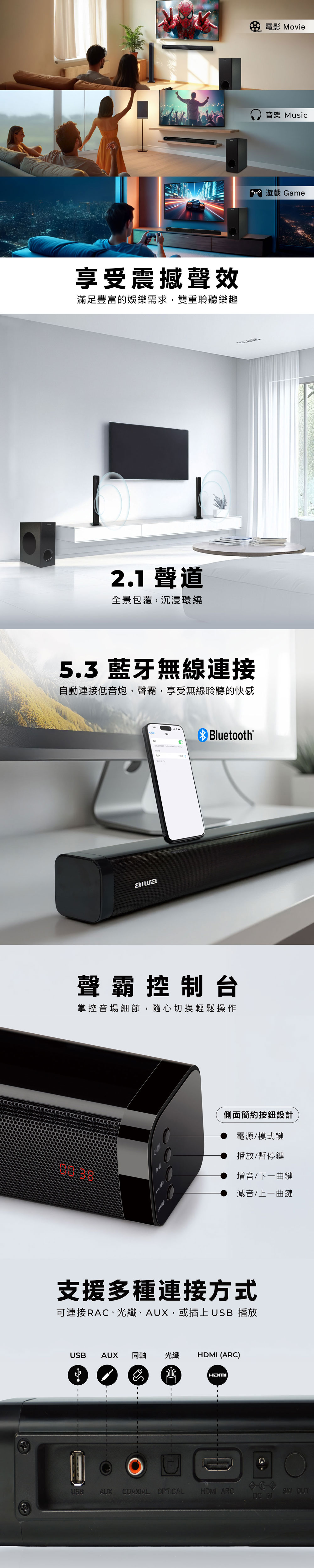 .光纖,同軸和AUX輸入支援大多數電視和音訊設備