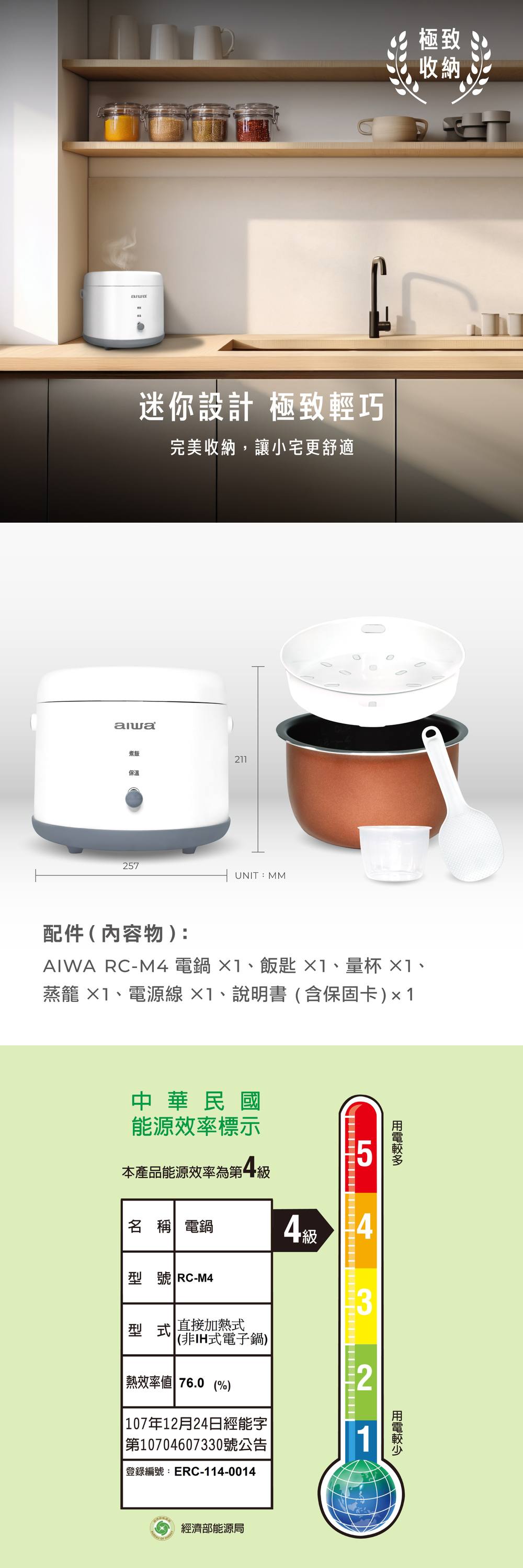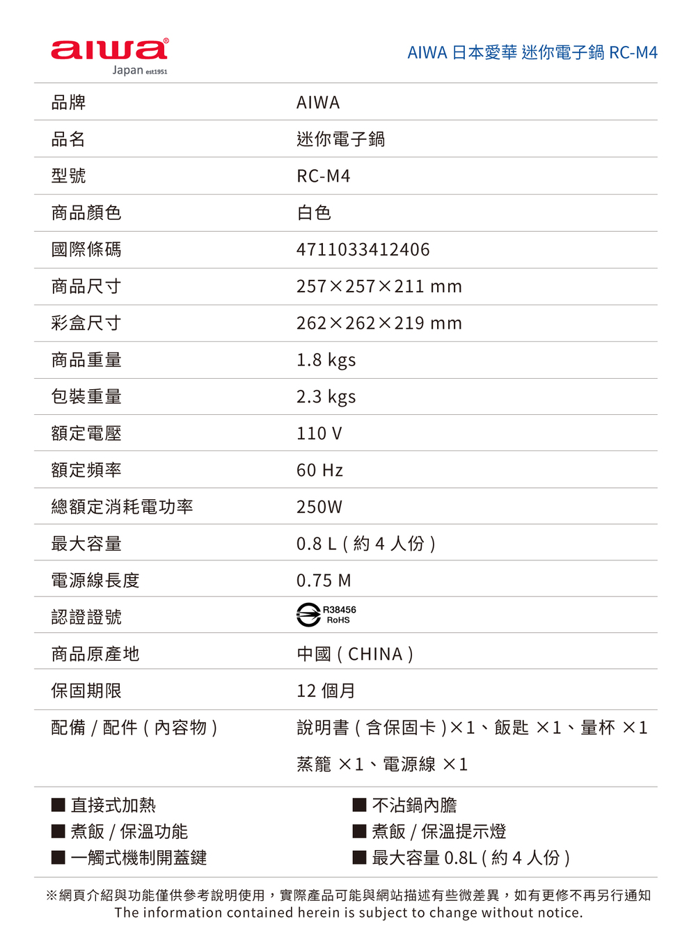 AIWA 愛華 四人份迷你電子鍋 RC-M4