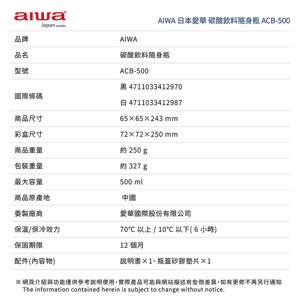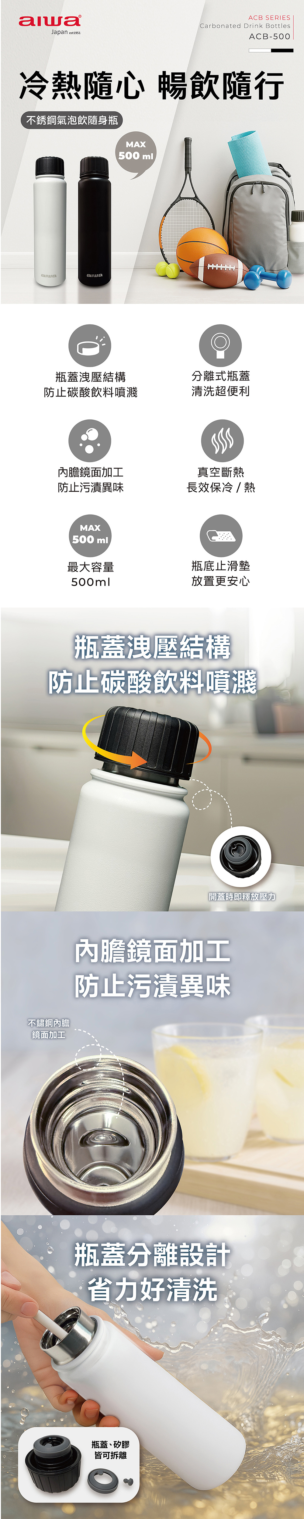 AIWA 愛華 不銹鋼氣泡飲隨身瓶 ACB-500