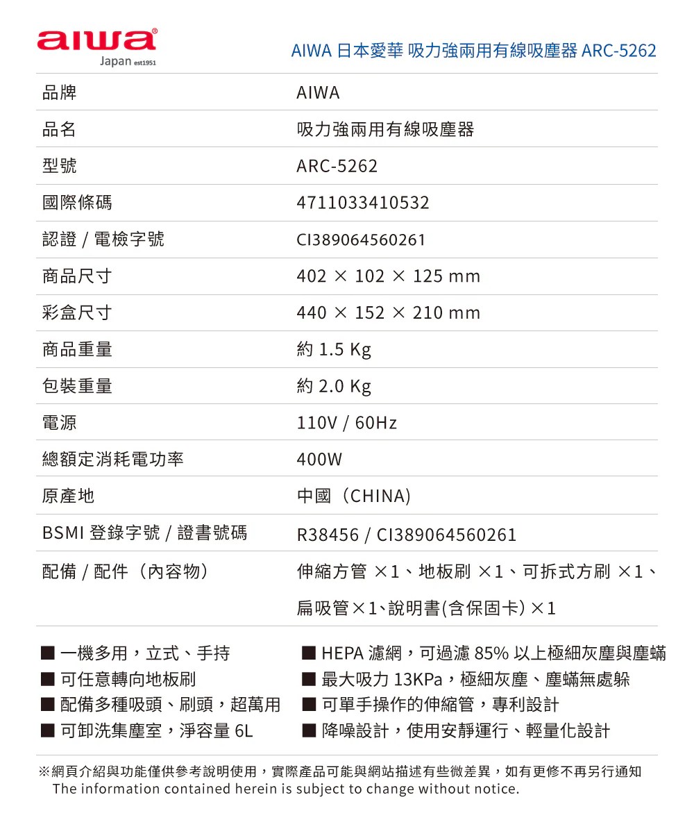AIWA 愛華 吸力強兩用有線吸塵器 ARC-5262